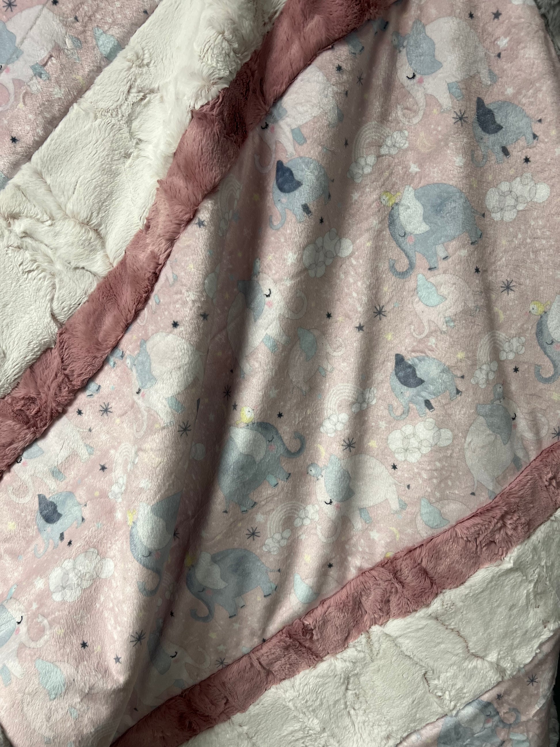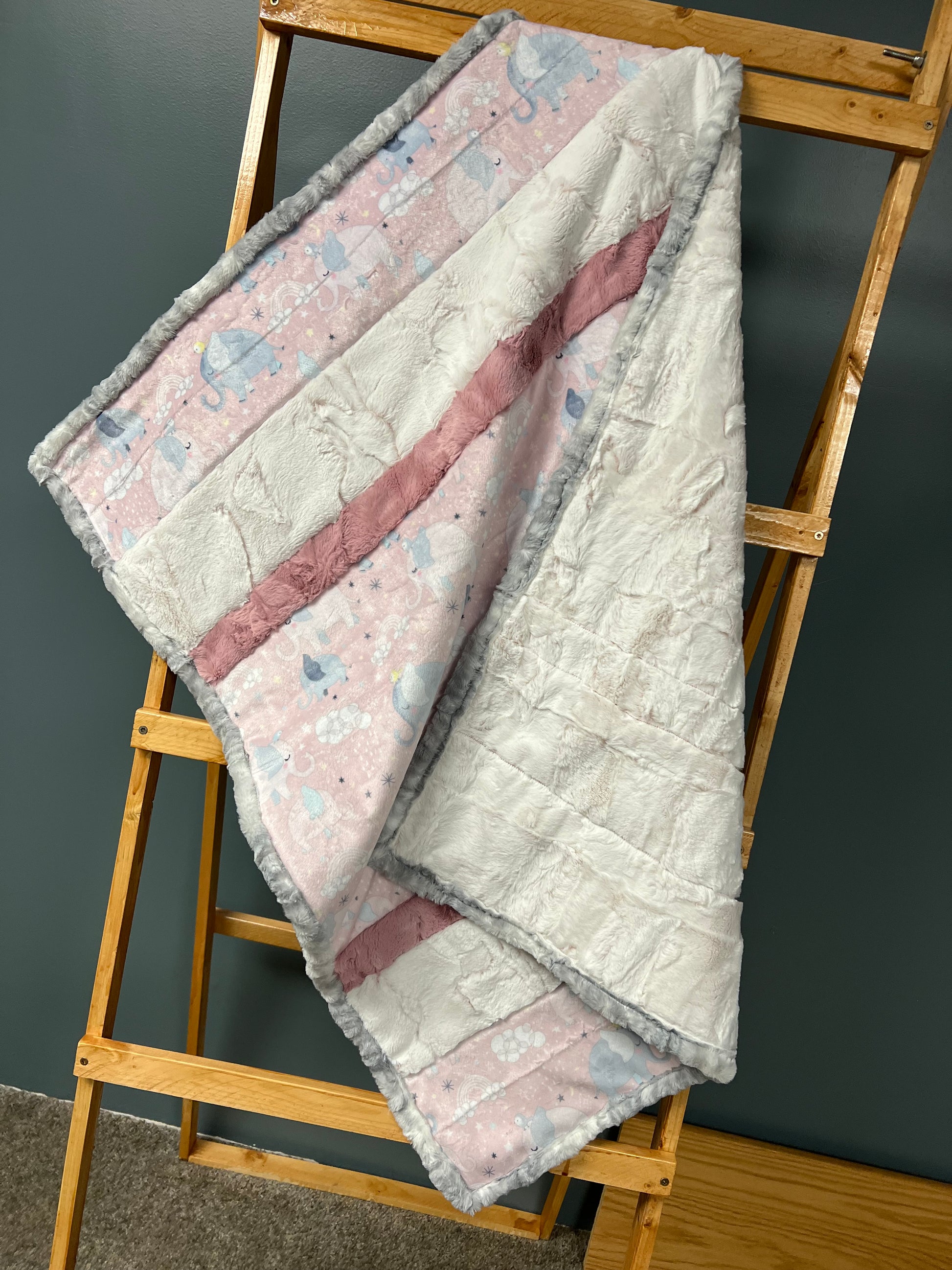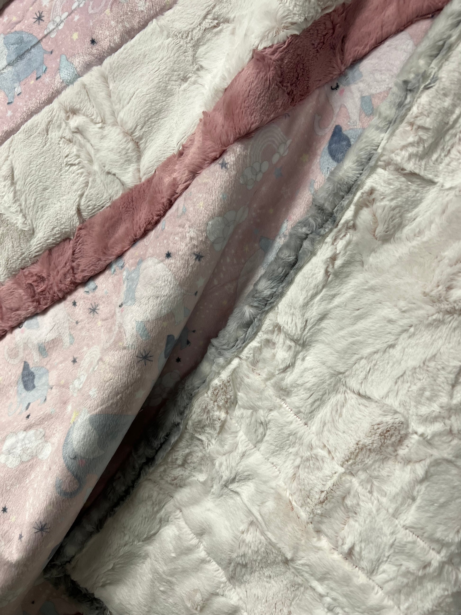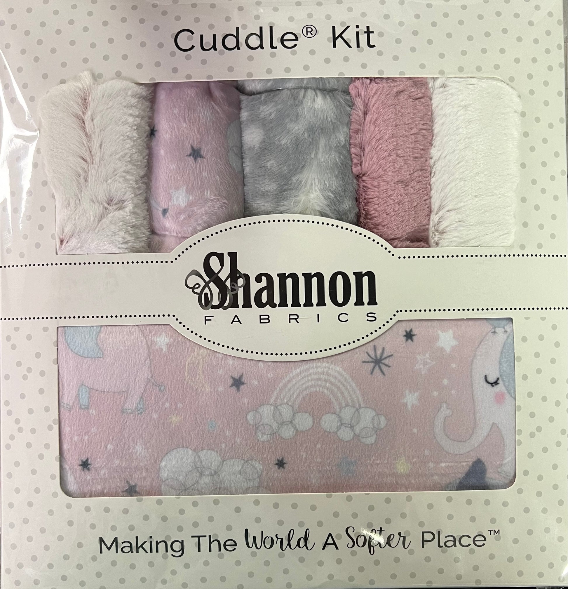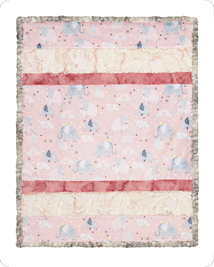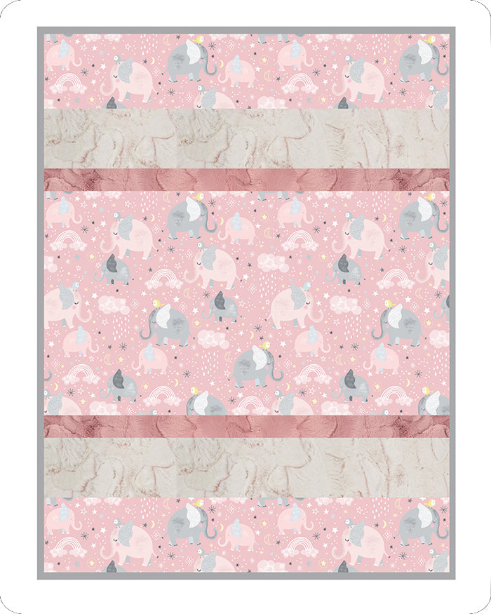 There's nothing more special than the bond between a mother and her child. This darling quilt features our Mama & Me Digital Cuddle® Rosewater print with mama elephants and baby elephants meandering through rainbows, stars and moons (and cute little birds are along for the ride, too), and will quickly be an inseparable naptime companion for any little baby boy or girl. Our Rose variation also includes Luxe Cuddle® Frosted Hide Rosewater for the top and backing, Luxe Cuddle® Hide Woodrose for the top, and Luxe Cuddle® Fawn Silver for the binding. This Bambino Cuddle® kit is approximately 28" by 37" and includes a pattern and strips for the quilt top, backing and binding.