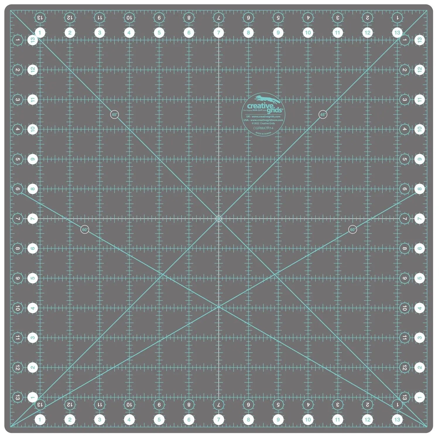 The Creative Grids® rotating cutting mat makes squaring up blocks up to 14in easy and efficient. Rotating mat is self-healing, and rotates a full 360º. Marked with a 1in grid that includes 1/8in markings along with 45 and 60 degree angled lines. White horizontal and vertical lines cross in the center of the rotating mat making it easy to trim embroidered blocks to size. Numbers are printed facing the outside of the rotating mat on all four sides with matching numbers across the mat. No matter which side you're working from, you'll always have a set of numbers to read that are right side up. Non-slip base gives you a stable cutting surface and is light-weight for taking along to retreats. This rotating mat is perfect for working with any of our Creative Grids® Trim Tools and Rulers. Simply trim, rotate the mat, and trim again.