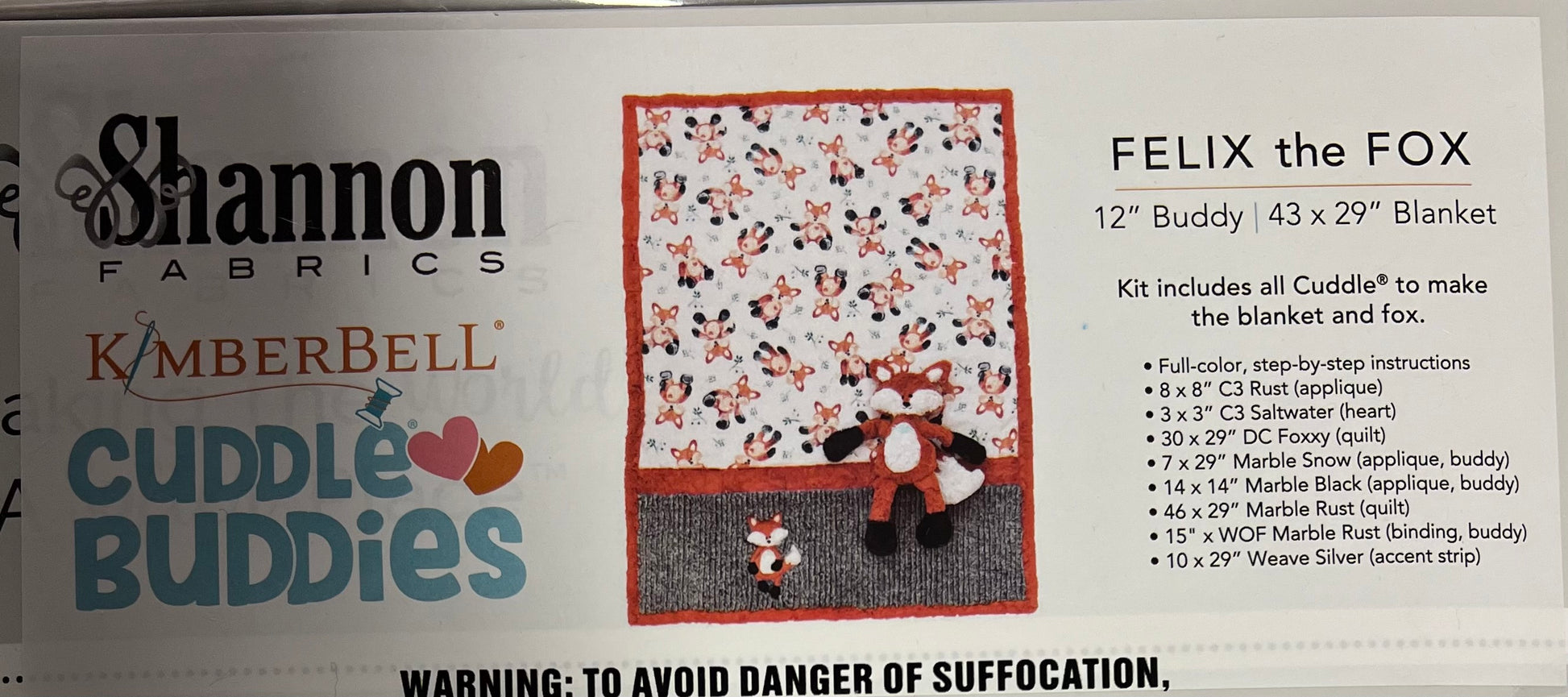 Shannon Fabrics has partnered with our friends at Kimberbell to create a kit that pairs our Cuddle® fabric and Lullaby quilt design with their pattern for the cutest fox stuffie you've ever seen! Named "Felix the Fox", this Cuddle® Buddies Kit includes the fabrics to make the blanket and stuffed animal, as well as the pattern for each. Machine applique fabric and instructions are also included. Additional and optional Felix the Fox machine embroidery design (for the blanket and the stuffed fox) can be purchased via an electronic download through Kimberbell. Note that if you buy six or more "Felix the Fox" kits, you can purchase the finished kit - makes a great display and selling tool for shops!