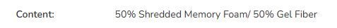 - Content: 50% Shredded Memory Foam/ 50% Gel Fiber