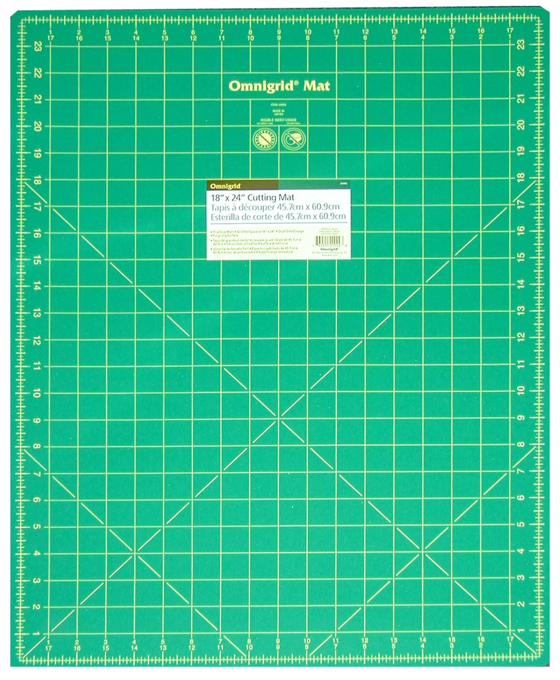 Mat made for double sided usage, the green side for light fabrics and the light gray for dark fabrics. The green side has a yellow grid that extends to the edge of the mat for both right and left handed users. This mat is designed to keep your rotary cutting blades sharp longer. Great to use with rotary cutters and Omnigrid rulers. Keep out of sunlight and store flat, do not roll up. 18in x 24in - with 1in grid, perfect for take-a-long, classrooms, beginners, quilting, crafts, memory books and more.