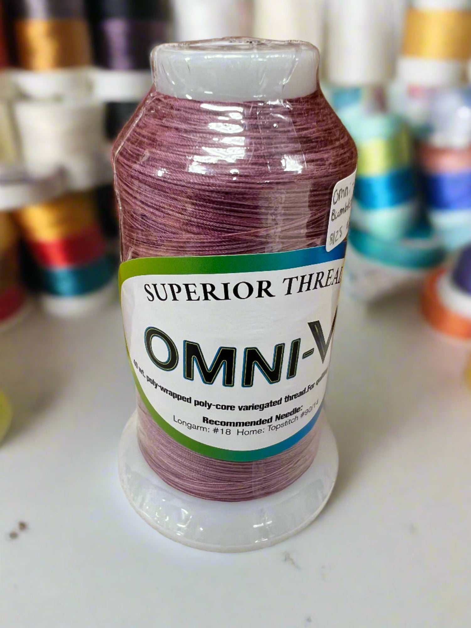 OMNI-V is a 40 wt. 2-ply corespun (poly-wrapped poly core) thread we designed for quilting on home machines and longarm machines. The beautiful, variegated colors have excellent color tone and change every inch. High strength and a subtle matte finish make OMNI-V an excellent quilting thread. 2000 yards per cone.